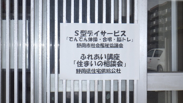 写真は10月9日(木)に開催した県営興津団地(静岡市清水区興津中町)における静岡市社会福祉協議会「S型デイサービス」と静岡県住宅供給公社「住まいの相談会」の共催の様子です。S型デイサービスは運営ボランティアにより団地集会所で毎月2回開催されていますが、当日は「でんでん体操」、「合唱」、「脳トレ」が行われました。参加者からは「住民同士で声掛けをして参加している」、「94才の女性も体操が好きになった」「参加がとても楽しみ」等の感想をいただきました。「住まいの相談会」には新築棟建設に係る相談がありました。